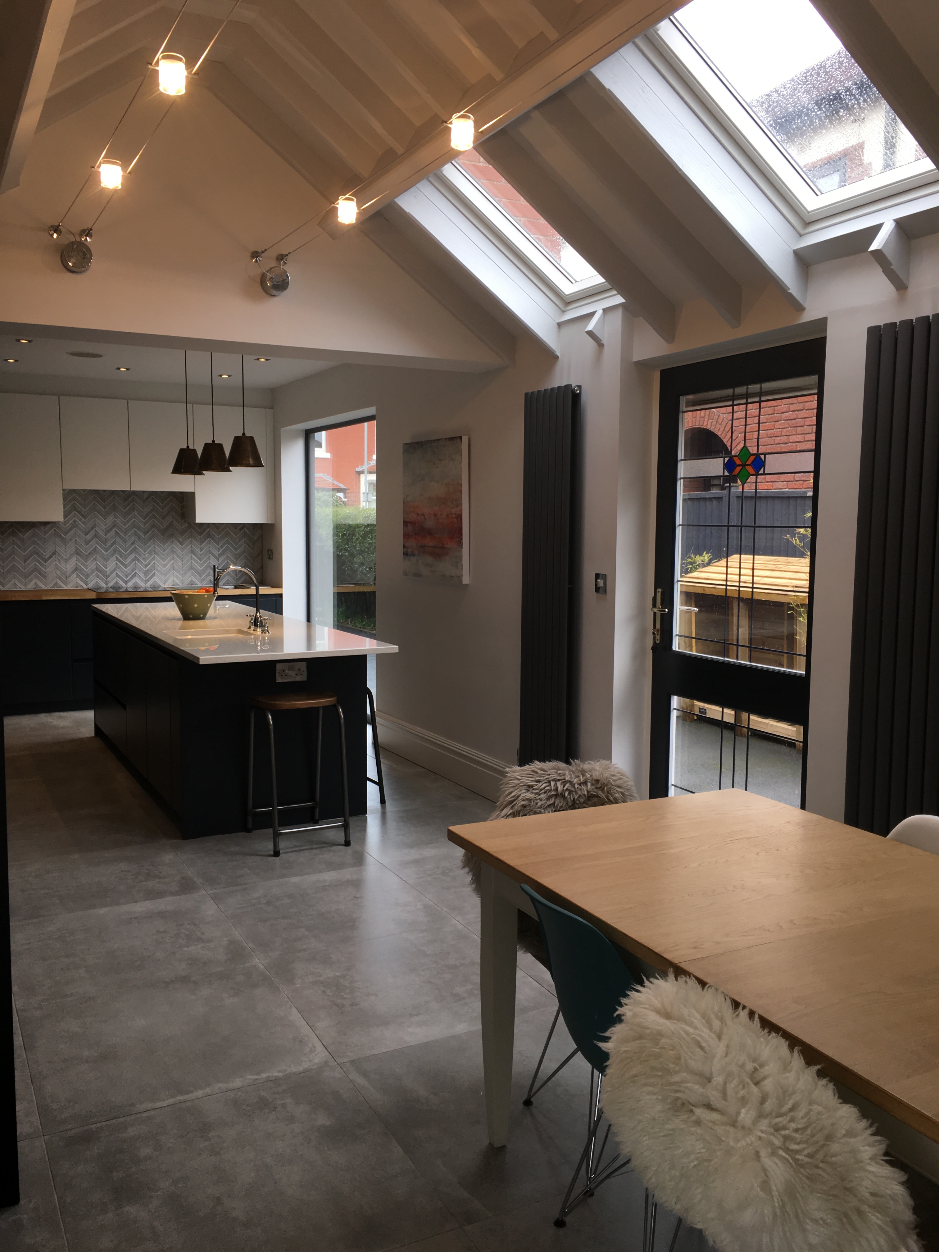Our Cement Porcelain tiles laid in the 750×750 size in this gorgeous kitchen/living space.