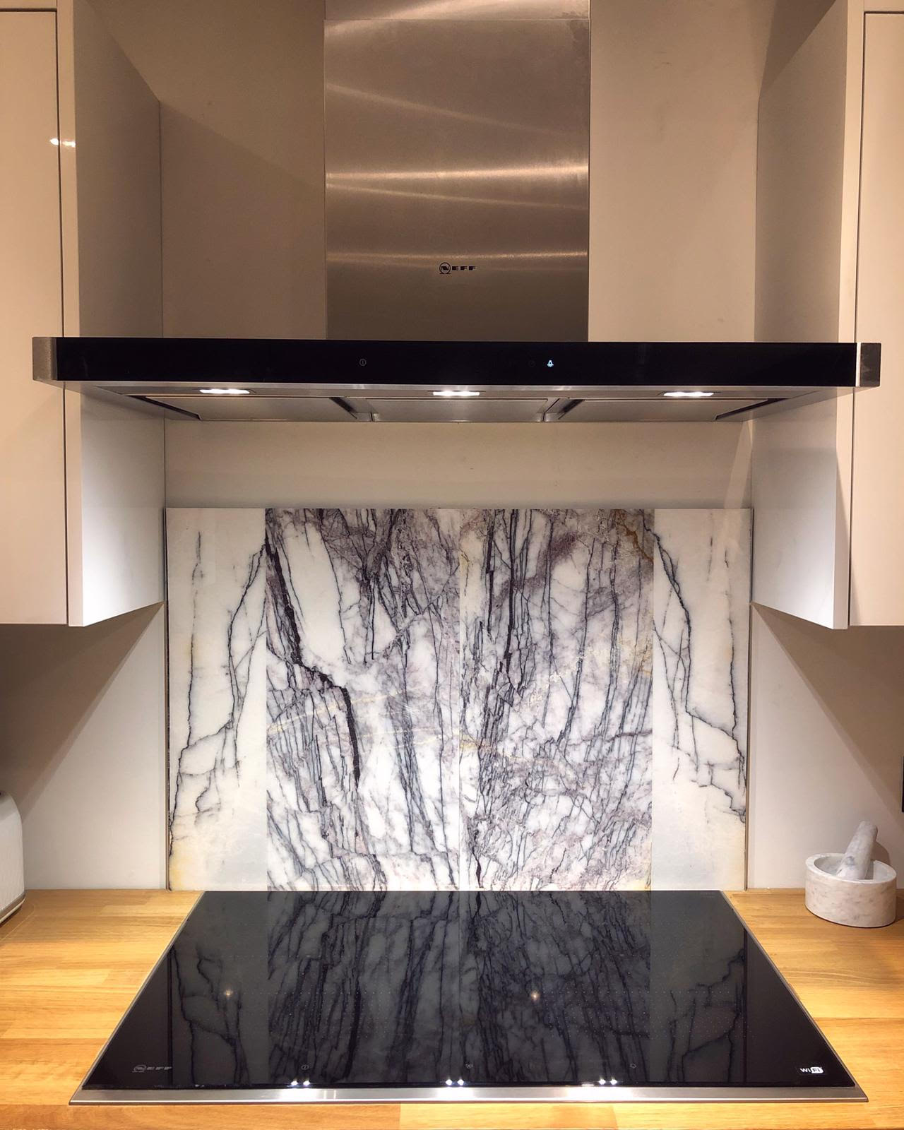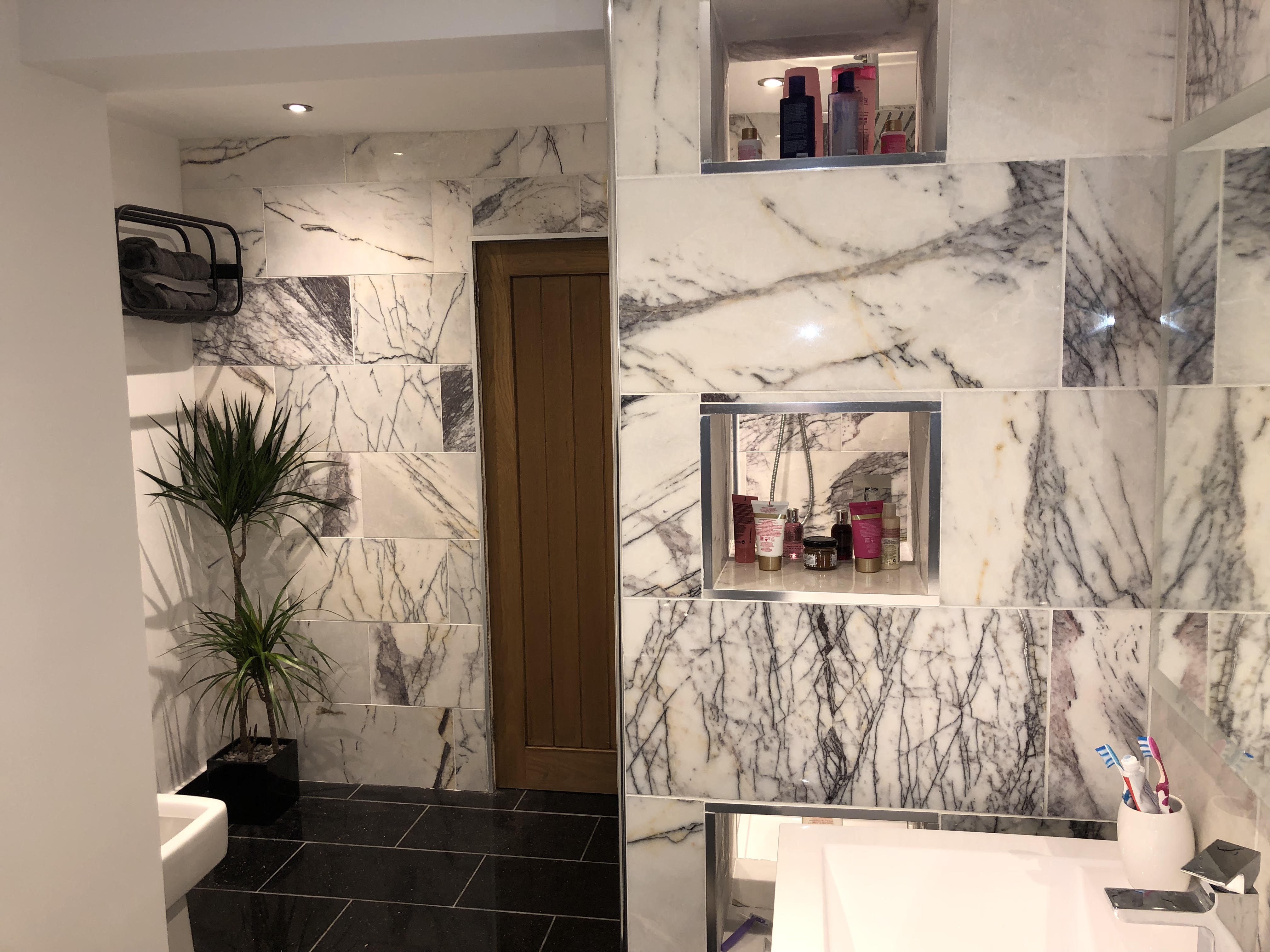 The second tile I mentioned was our Torrente Polished Marble, which again, has been designed to make a statement! This gorgeous marble tile has a predominately white background with striking violet and amber veins running through and would be a perfect option for use in a bathroom, or for those more daring customers, you could even use it in a kitchen. A customer of mine recently purchased some of our Torrente Polished Marble and I received some images from them earlier in the week and the first word that came to mind was ‘wow!’ It has created such a feature in this gorgeous bathroom and they even used a few spare tiles as a splashback in their kitchen!