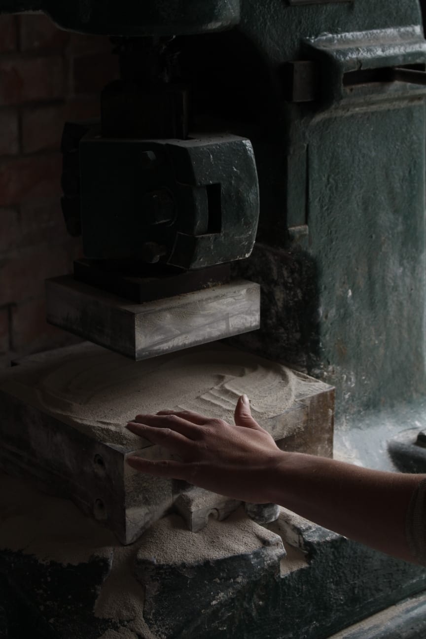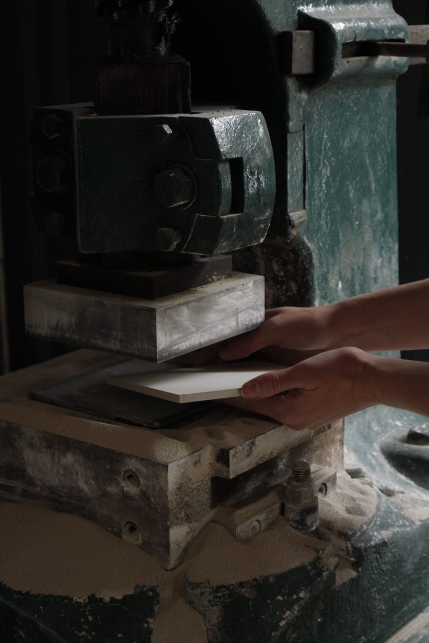 By releasing the large swinging arms, this creates the right momentum to force the heavy ‘punch’ down and press perfectly into the mould. After a few swings and a firm stamp on the pedal, the pressed tile is now clear to carefully pull away from the press. It’s fascinating that dry powder can be instantly turned into a tile!