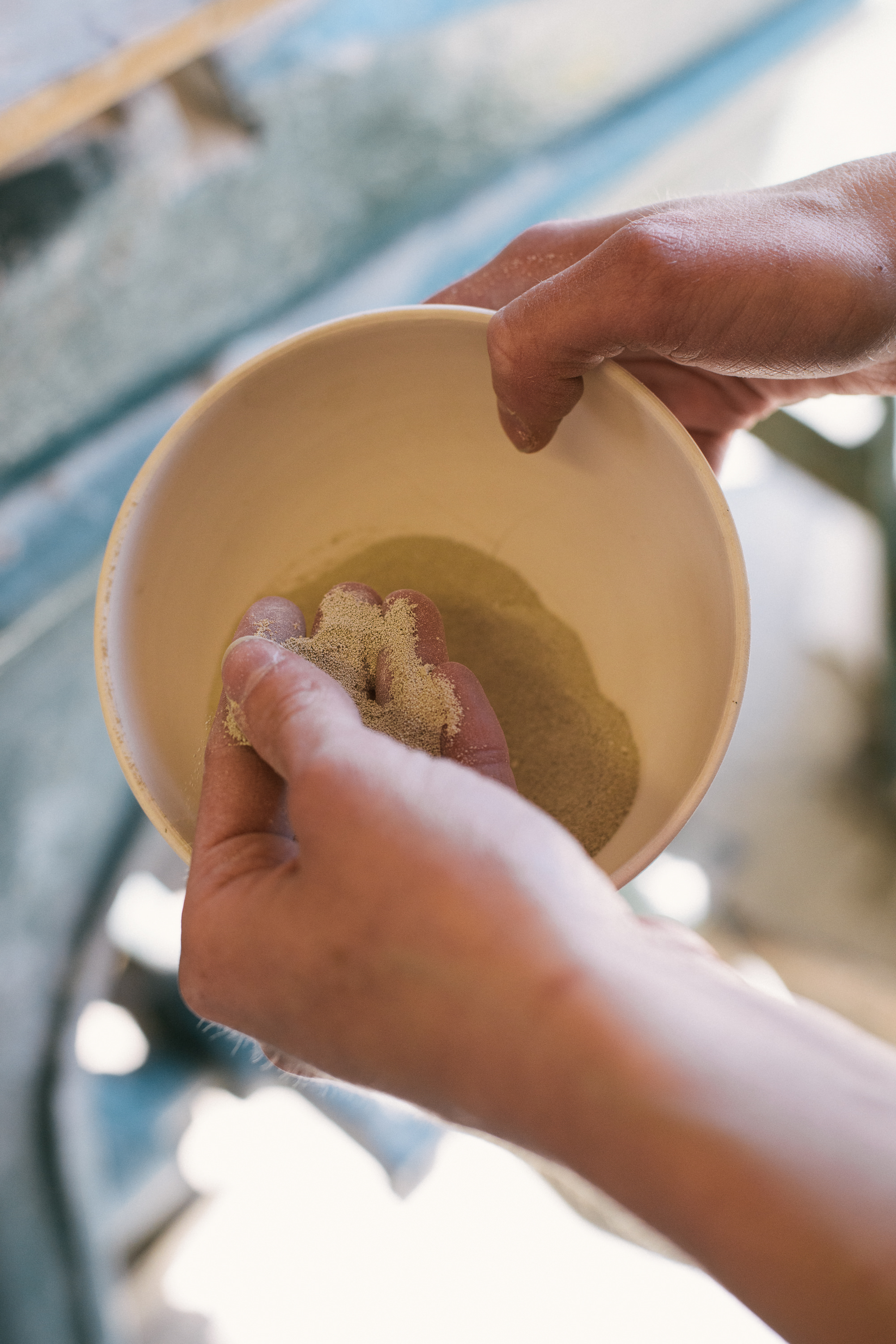 Using Earthenware clay powder, the powder is carefully scattered into the mould.